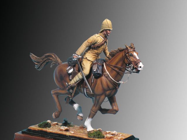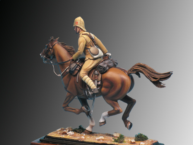 La primera fila del regimiento de dragones llevaba lanzas desde 1892, junto con la carabina Lee-Metford y la espada modelo de 1890 en una funda en la silla de montar. La figura está equipada con bandolera porta munición para la caballería en esa época. Constaba de cinco cartucheras que contenían diez cartuchos. Se abrochaban a un cinturón y se llevaba sobre el hombro izquierdo. Mochila, cantimplora y cinturón con correas para la espada abrochadas juntas. Los húsares llevaban el cinturón debajo de la casaca.